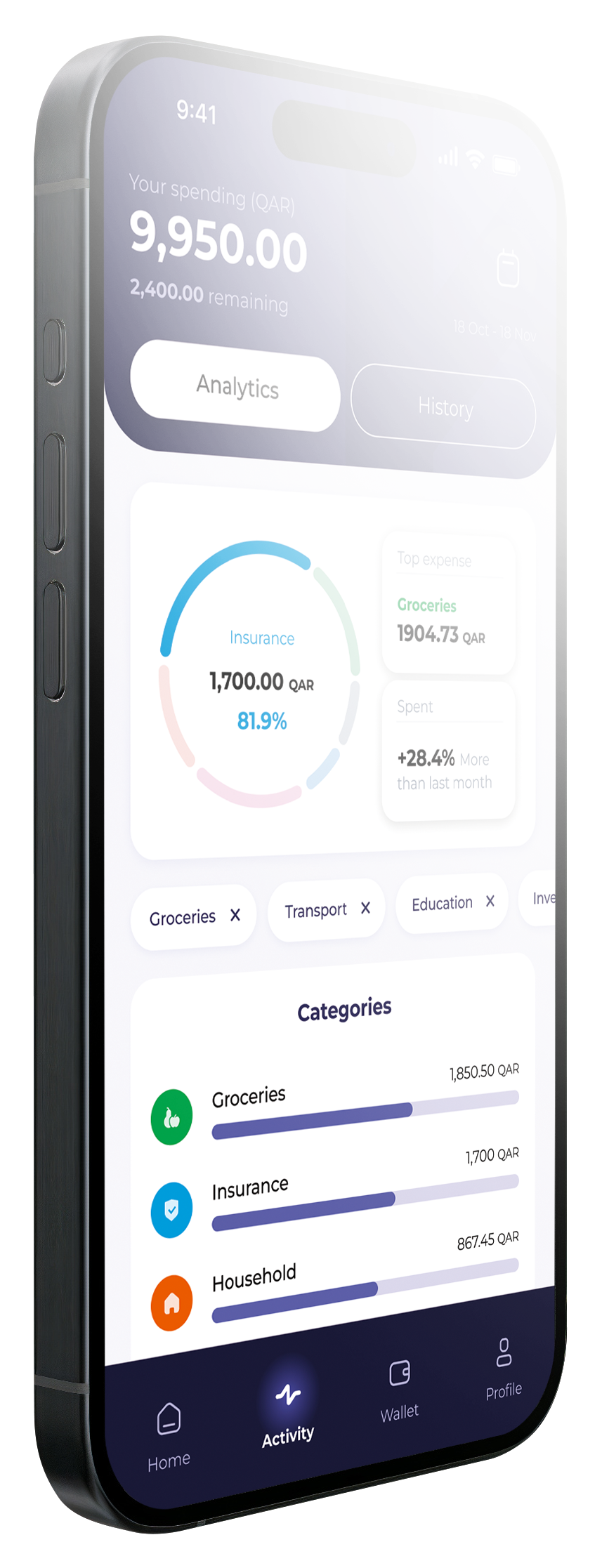 Use our tracking features in a way that fits you best. Karty allows you to set monthly budgets, and track your expenses on different categories.